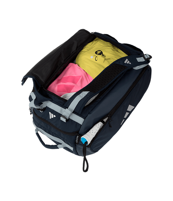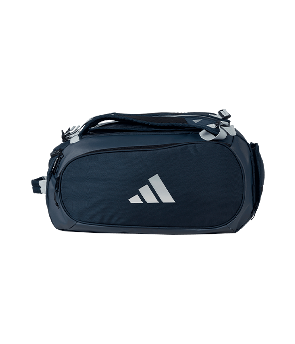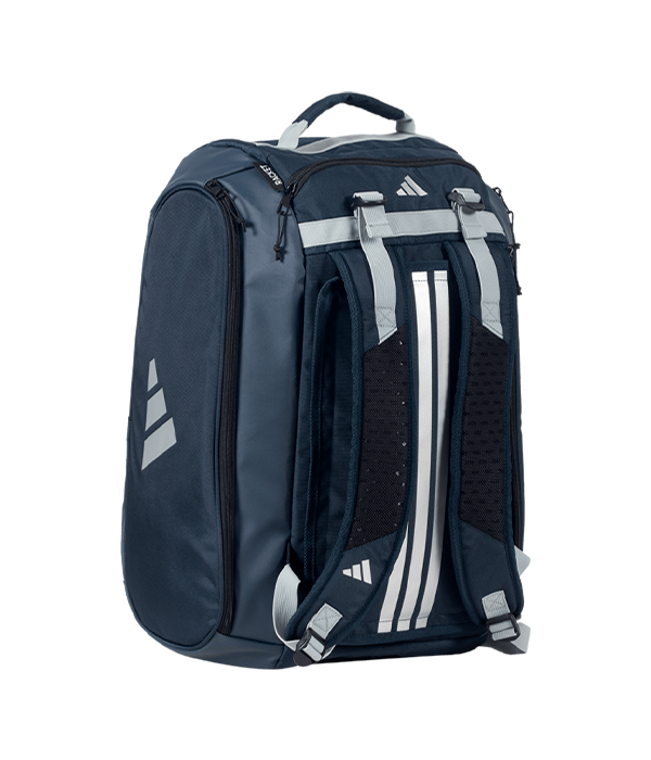 Paletero Adidas Tour azul marino con un amplio compartimento central con cremallera para almacenar ropa y equipamiento. Integra dos bolsillos laterales con protección thermo para proteger hasta dos palas en cada lado. Además, esta mochila incluye un bolsillo inferior ventilado para calzado. La mochila está equipada con dos correas de malla acolchada ajustables.